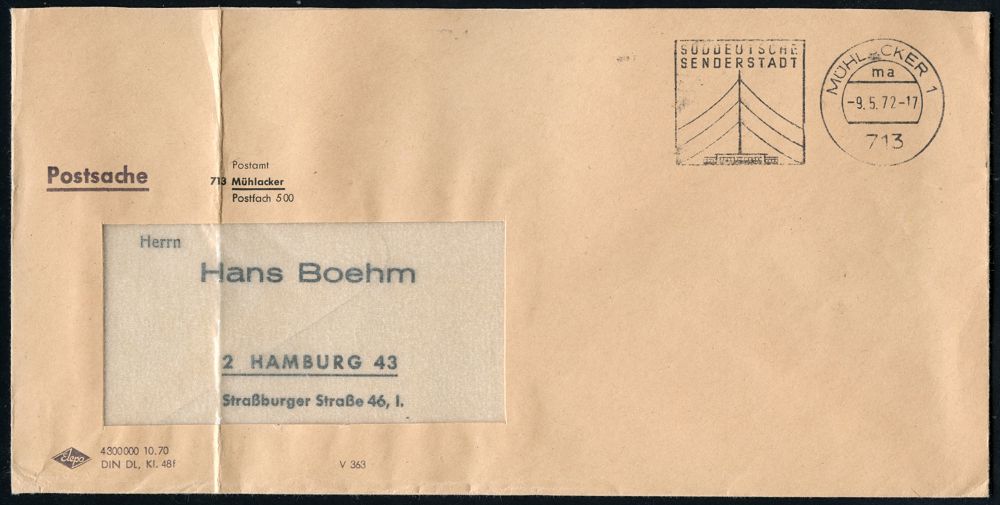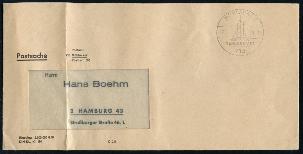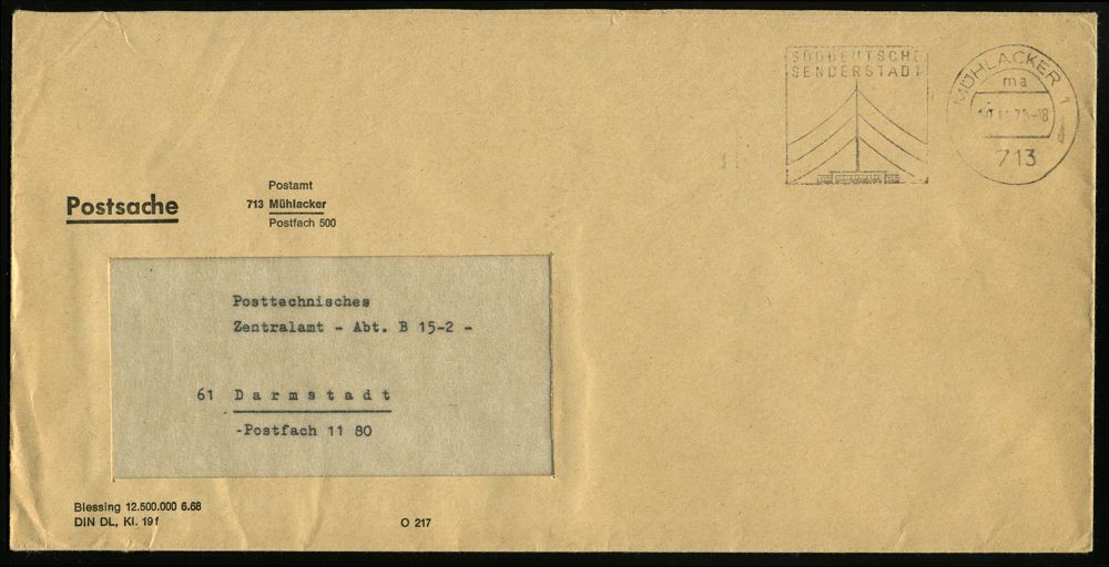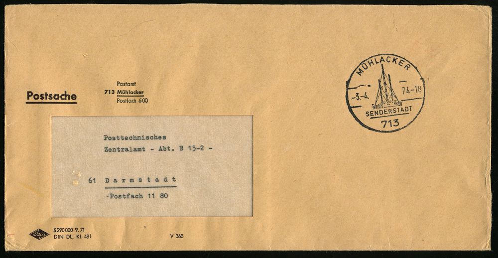 4139 | 12 € | POSTLEITRAUM 7100 (OHNE HEILBRONN u. LUDWIGSBURG) : 713 MÜHLACKER 1/ SENDERSTADT 1971/72 HWSt u n d MaWSt (je Sender mit Sendemast) je auf Post-Dienst-Bf.: mit abs. (je Falte links) 2 Belege (Bo.4 A II, Bo.5) | ![]() ![]() | |