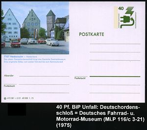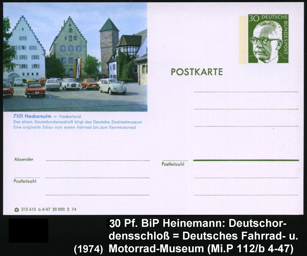4146 | 9 € | POSTLEITRAUM 7100 (OHNE HEILBRONN u. LUDWIGSBURG) : 7107 Neckarsulm 1974/75 30 Pf. BiP Heinemann, grün u. 40 Pf. BiP Unfall: Deutschordensschloß birgt das.. Deutsche Zweiradmuseum.. vom ersten Fahrrad bis zum Rennmotorrad (Deutschordensschloß = Museum) je ungebr. (Einzelverkauf möglich: je 5.- EUR) 2 Belege (Mi.P 112/b4 , P 116/c 3) | ![]() ![]() | |