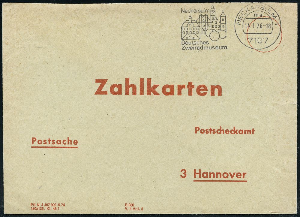 4147 | 16 € | POSTLEITRAUM 7100 (OHNE HEILBRONN u. LUDWIGSBURG) : 7107 NECKARSULM 1/ ma/ Deutsches/ Zweiradmuseum 1980 (14.1.) MWSt (Zweirad-Museum = Deutschordensschloß) auf PSch-Innendienst-Bf.: Zahlkarten (grün/braun) für Zahlkarten-Austausch, seltene Verwendung! (Bo.3 A I) | ![]() | |
