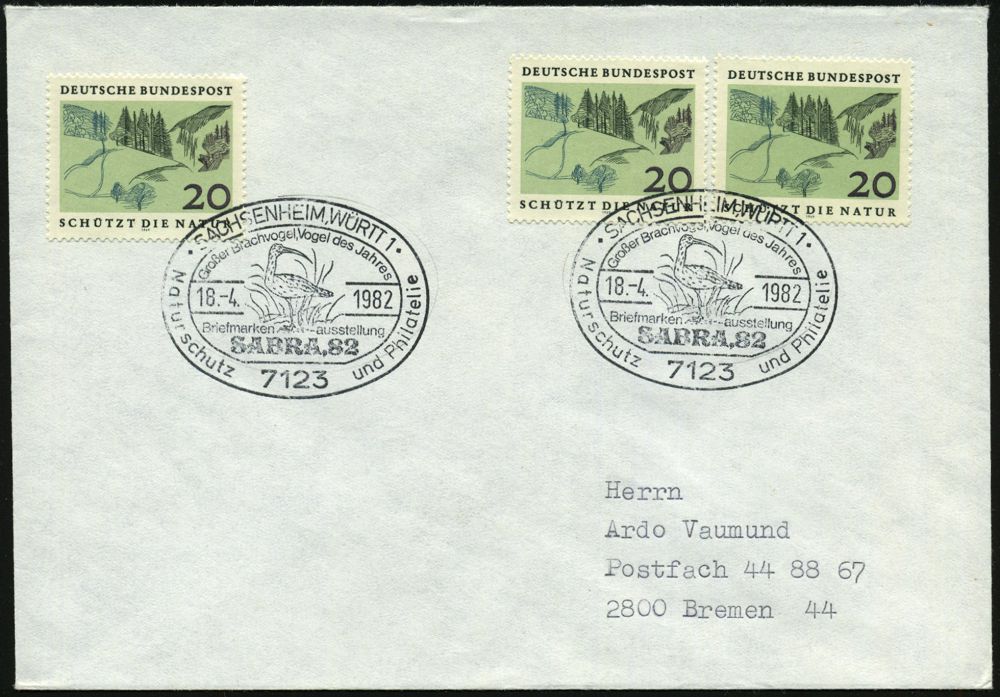4159 | 16 € | POSTLEITRAUM 7100 (OHNE HEILBRONN u. LUDWIGSBURG) : 7123 SACHSENHEIM,WÜRTT 1/ Großer Brachvogel../ Naturschutz u.Philatelie 1982 (18.4.) SSt = Gr. Brachvogel 2x klar auf 3x 20 Pf. "Naturschutz" (Mi.592 MeF) Inl.-Bf., seltene Kombination! (Bo.3) | ![]() | |