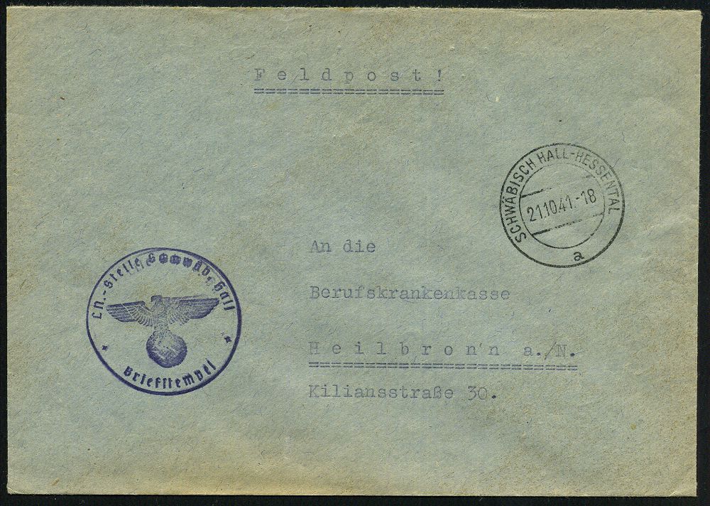 4168 | 15 € | POSTLEITRAUM 7100 (OHNE HEILBRONN u. LUDWIGSBURG) : SCHWÄBISCH-HALL-HESENTAL/ a 1941 (21.10.) 2K-Steg + viol. 1K-HdN: L(uftwaffe)n.-Stelle Schwäb.-Hall (= Luftnachrichtenstelle) Feldpost-Bf. n. Heilbronn | ![]() | |