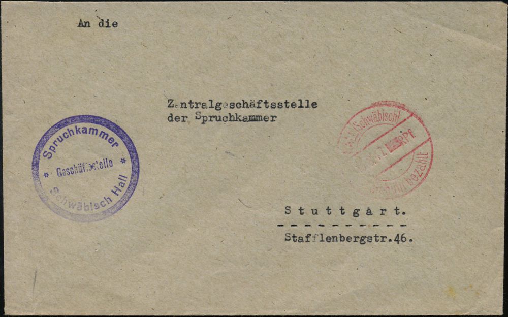 4172 | 18 € | POSTLEITRAUM 7100 (OHNE HEILBRONN u. LUDWIGSBURG) : Schwäbisch-Hall 1947 (16.8.) roter 1K-Brücken-PFS.: HALL (Schwäbisch)/...RPf./Gebühr bezahlt (Wertangabe geblockt) + viol. 1K-HdN: Spruchkammer/..Schwäb.Hall = Entnazifizierungs-Ausschuß, Fern-Bf. = Zeitgeschichte! (Dü.25) | ![]() | |