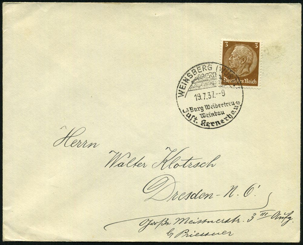 4184 | 16 € | POSTLEITRAUM 7100 (OHNE HEILBRONN u. LUDWIGSBURG) : WEINSBERG (WÜRTT)/ Burg Weibertreu/ Weinbau/ Just.Kernerhaus 1937 (19.7.) HWSt = Burg "Weibertreu" (u. Weinberge) Justinus Kerner, Arzt u. Dichter 1786 - 1862, klar gest. Inl.-Bf. (Bo.2 , Erstjahr) | ![]() | |