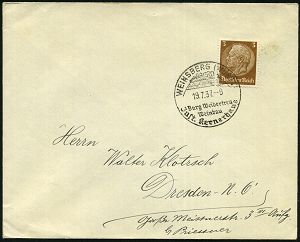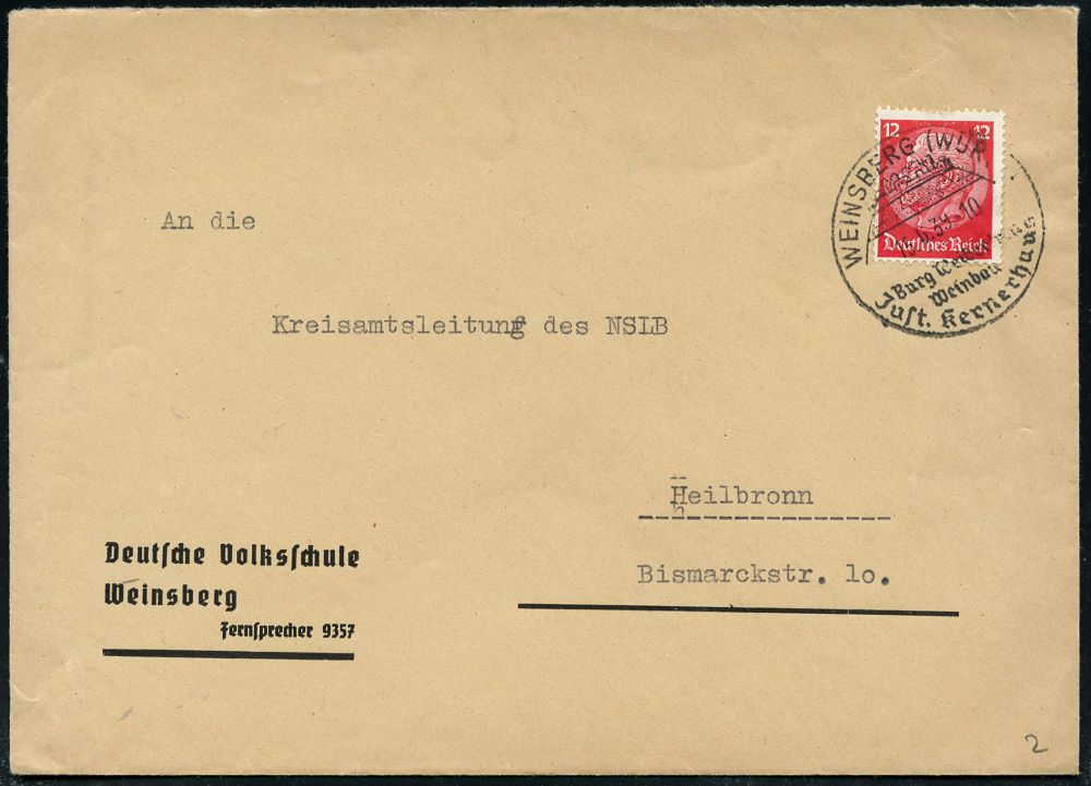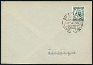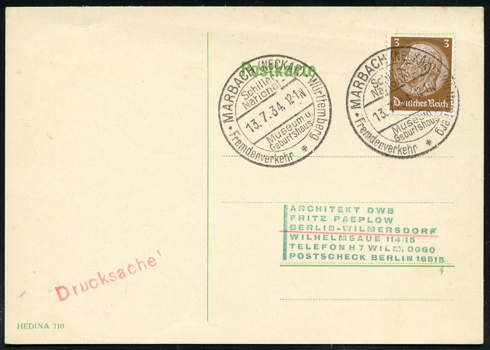 4119 | 20 € | POSTLEITRAUM 7100 (OHNE HEILBRONN u. LUDWIGSBURG) : MARBACH (NECKAR)/ Schiller-/ National-/ Museum u./ Geburtshaus.. 1934 (10.11.) HWSt auf EF 6 Pf. Schiller (Mi.554) Nachverwendung nach 10 Jahren Pause klar auf Inl.-Bf.! (gering verkürzt) seltene Kombination! (Bo.1) | ![]() | |