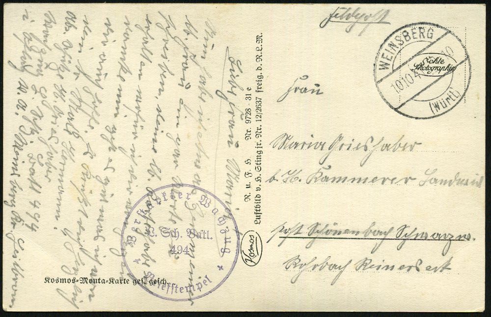 4186 | 15 € | POSTLEITRAUM 7100 (OHNE HEILBRONN u. LUDWIGSBURG) : WEINSBERG/ (Württ) 1941 (10.10.) 1K-Brücke + viol. 1K-HdN: Verstärkter Wachzug/ L.(andes) Sch.(ützen) Batl./494 , klar gest. s/w.-Feldpost-Ak.: Weinsberg (5 Ansichten) n. Schönenbach/Schwarza | ![]() ![]() | |