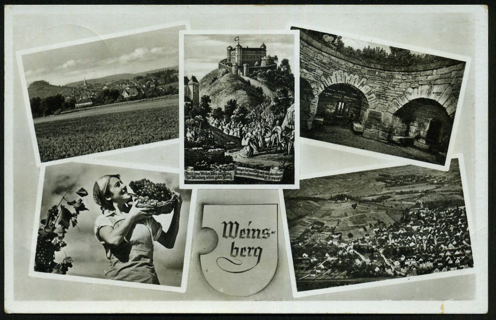 4185 | 20 € | POSTLEITRAUM 7100 (OHNE HEILBRONN u. LUDWIGSBURG) : WEINSBERG (WÜRTT)/ Burg Weibertreu/ Weinbau/ Just.Kernerhaus 1939 (15.6.) HWSt = Burg "Weibertreu" (u. Weinberge) Justinus Kerner, Arzt u. Dichter 1786 - 1862, klar gest. Dienst-Bf.: Deutsche Volksschule Weinsberg.. (Bo.2) | ![]() | |