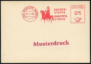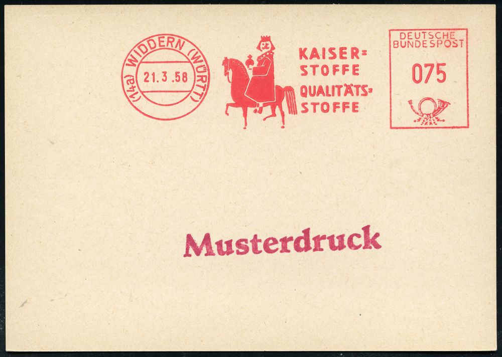 4196 | 18 € | POSTLEITRAUM 7100 (OHNE HEILBRONN u. LUDWIGSBURG) : (14a) WIDDERN (WÜRTT)/ KAISER=/ STOFFE.. 1958 (21.3.) AFS Francotyp-Archivmuster "Posthorn" 075 Pf. (Kaiser zu Pferd) klar gest. Francotyp-Archiv-Karte,a.Muster-Kt. selten! (Dü.E-23COE-23) | ![]() | |