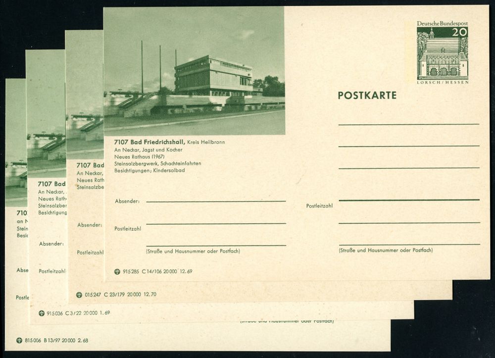 4005 | 18 € | POSTLEITRAUM 7100 (OHNE HEILBRONN u. LUDWIGSBURG) : 7107 Bad Friedrichshall 1968/70 4 verschied. BiP 20 Pf. Lorsch, grün: Neues Rathaus.. , alle ungebr. (Einzelverkauf möglich: je 5.- EUR) 4 Belege (Mi.P 96/B 13, P 99/C 3, C 14, C 23) | ![]() | |