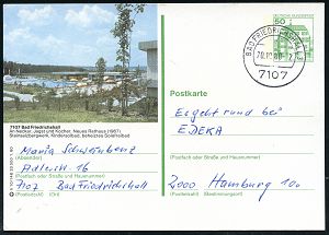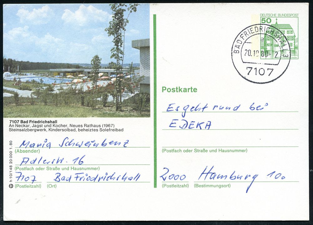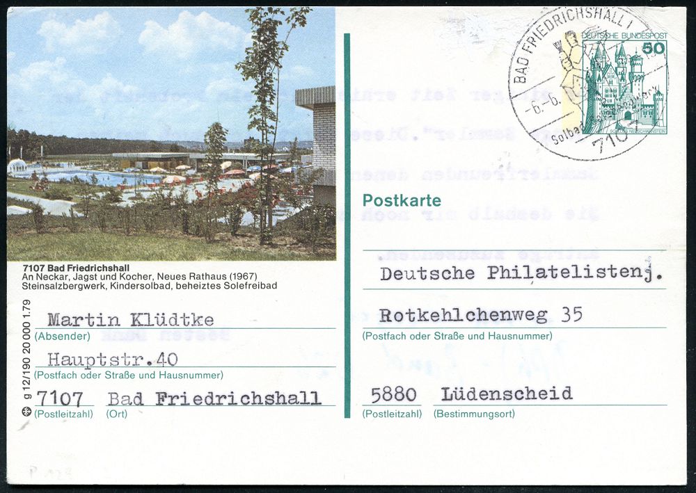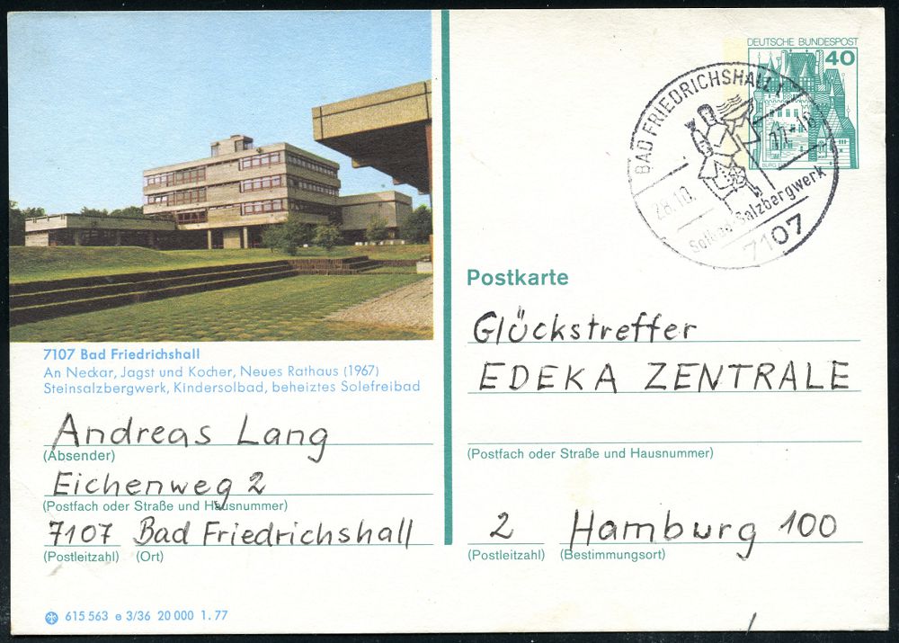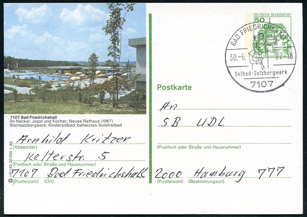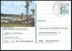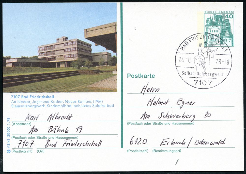 4006 | 20 € | POSTLEITRAUM 7100 (OHNE HEILBRONN u. LUDWIGSBURG) : 7107 BAD FRIEDRICHSHALL 1/ Solbad u. Salzbergwerk 1977/80 (28.10.) HWSt (Bergmann mit Salzkristall etc.) je a ortsgleicher BiP 40 Pf. Eltz, blaugrün: Neues Rathaus (Einzelverkauf möglich je 12.- EUR) 2 Belege, seltene Kombination! (Mi.P 124, P 125) | ![]() ![]() | |