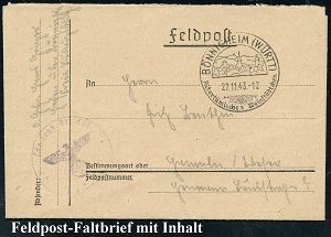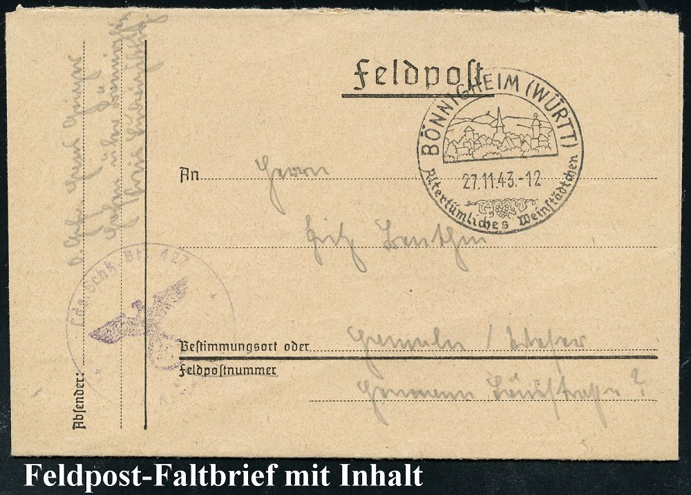 4017 | 15 € | POSTLEITRAUM 7100 (OHNE HEILBRONN u. LUDWIGSBURG) : BÖNNIGHEIM (WÜRTT)/ Altertümliches Weinstädtchen 1943 (27.11.) HWSt (Ortsbild, Traube) + viol. 1K-HdN: Lds. Schtz. Btl. 422, klar gest. Feldpost-Faltbf. mit Inhalt!, (Bo.3) | ![]() | |