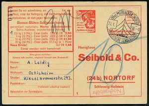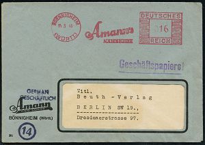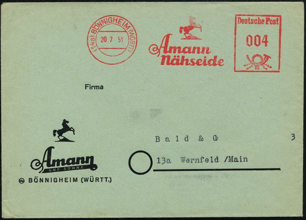 4019 | 15 € | POSTLEITRAUM 7100 (OHNE HEILBRONN u. LUDWIGSBURG) : (14a) BÖNNIGHEIM (WÜRTT)/ Amann/ Nähseide 1951 (20.7.) AFS Francotyp Deutsche Post "Posthorn" (Logo: springendes Pferd) auf motivgl. Firmen-Bf. (Dü.E-20CG) | ![]() | |