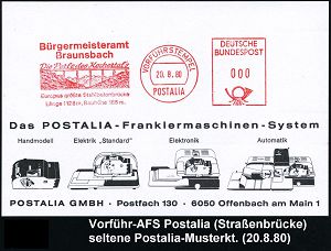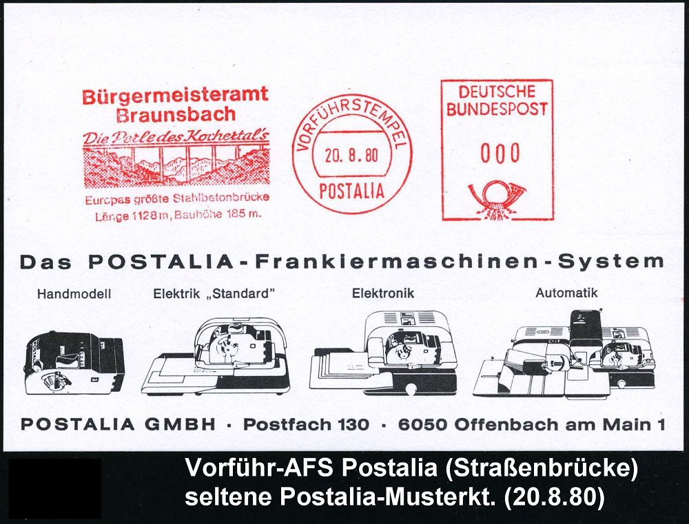4021 | 16 € | POSTLEITRAUM 7100 (OHNE HEILBRONN u. LUDWIGSBURG) : Braunsbach 1980 (20.8.) AFS: VORFÜHRSTEMPEL/POSTALIA/Bürgermeisteramt../Europas größte Stahlbetonbrücke/Länge 1128m, Bauhöhe 185m (Brücke) seltene Postalia-Muster-Kt. (= Specimen) | ![]() | |