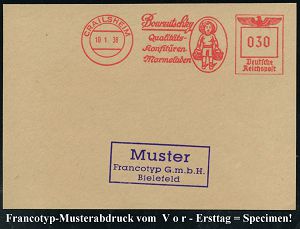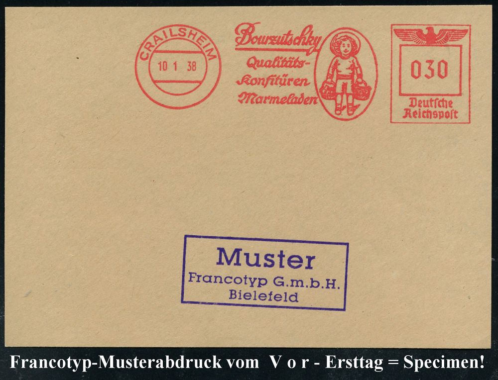 4022 | 35 € | POSTLEITRAUM 7100 (OHNE HEILBRONN u. LUDWIGSBURG) : CRAILSHEIM/ Bourzutschky/ Qualitäts-/ Konfitüren/ Marmeladen 1938 (10.1.) AFS-Musterabdruck Francotyp "Reichsadler" (Kind mit Sonnenhut u. Körbe mit Garten-u.Waldfrüchten) glasklar gest. Francotyp-Musterblatt vom V o r - Ersttag! (mit Attest), selten! (Dü.E-5CG) | ![]() ![]() | |