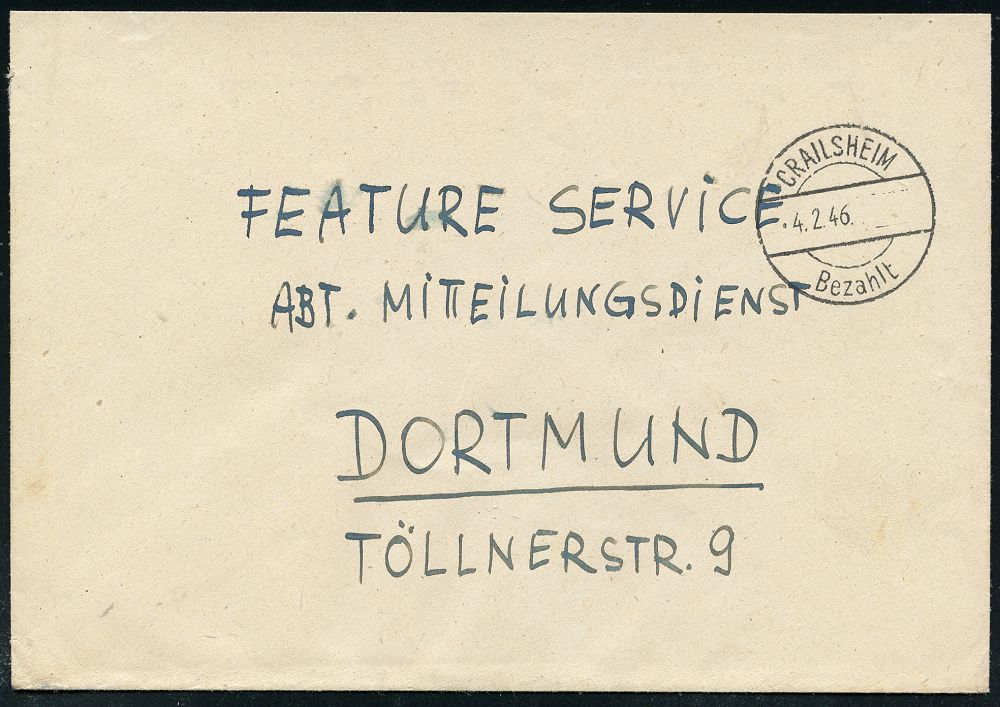 4025 | 15 € | POSTLEITRAUM 7100 (OHNE HEILBRONN u. LUDWIGSBURG) : CRAILSHEIM/ bezahlt 1946 (4.2.) schw. 1K-Brücke klar auf Inl.-Bf. an US Feature Service (= Suchdienst) n. Dortmund (Dü.A-6, Nr.27) | ![]() | |