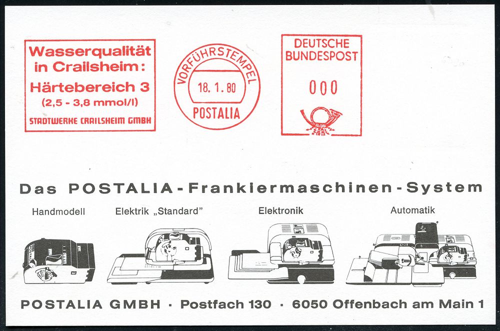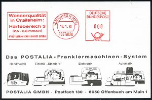 4029 | 16 € | POSTLEITRAUM 7100 (OHNE HEILBRONN u. LUDWIGSBURG) : CRAILSHEIM 1980 (18.1.) AFS: VORFÜHRSTEMPEL/POSTALIA/Wasserqualität../Härtebereich 3/ (2,5 - 3,8 mmol/l)/STADTWERKE, seltene Postalia-Muster-Kt.! (= Specimen) | ![]() | |