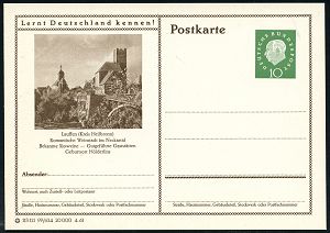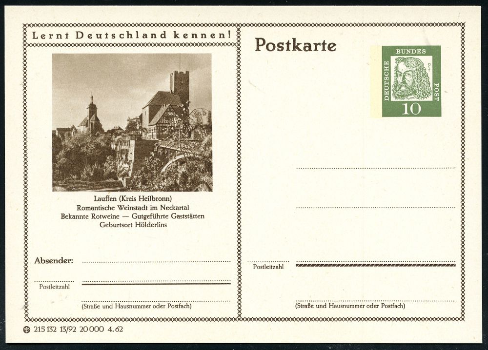 4058 | 10 € | POSTLEITRAUM 7100 (OHNE HEILBRONN u. LUDWIGSBURG) : Lauffen 1961/62 10 Pf. BiP Heuss III und 10 Pf. BiP Dürer: ..Bekannte Rotweine../Geburtsstadt Hölderlins (Ortsbild m. Turmhaus) ungebr. (Einzelverkauf möglich: je 6.- EUR) 2 Belege (Mi.P 53, P 72) | ![]() ![]() | |