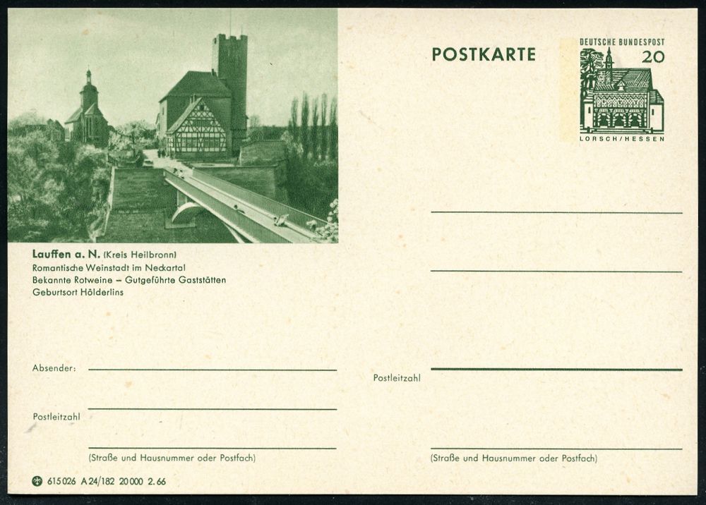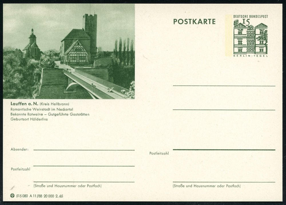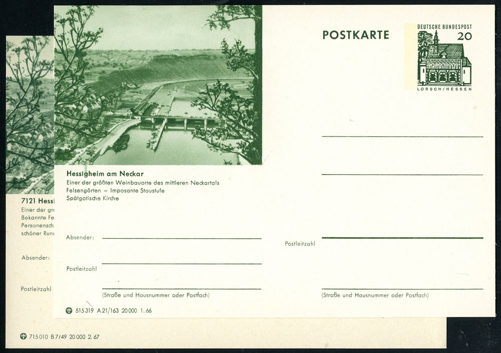 4059 | 8 € | POSTLEITRAUM 7100 (OHNE HEILBRONN u. LUDWIGSBURG) : Lauffen a.N. 1965/66 15 Pf. BiP Tegel u. 20 Pf. BiP Lorsch, grün: ..Bekannte Rotweinstadt/..Geburtsstadt Hölderlins (Ortsbild mit Turmhaus) je ungebr. (Einzelverkauf möglich: je 5.- EUR) 2 Belege (Mi.P 86, P 89) | ![]() ![]() | |