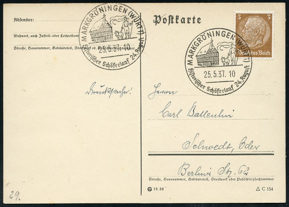 4125 | 14 € | POSTLEITRAUM 7100 (OHNE HEILBRONN u. LUDWIGSBURG) : MARKGRÖNINGEN (WÜRTT)/ Historischer Schäferlauf.. 1937 (25.5.) SSt (Fachwerkhaus, Schäfer u.Schaf) klar gest. Inl.-Karte (Bo.1) | ![]() | |