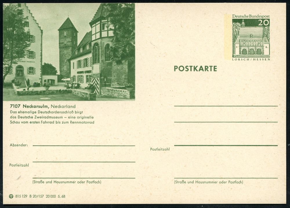 4145 | 9 € | POSTLEITRAUM 7100 (OHNE HEILBRONN u. LUDWIGSBURG) : 7107 Neckarsulm 1968/69 20 Pf. BiP Lorsch, grün: Deutschordensschloß birgt das.. Deutsche Zweiradmuseum.. vom Ersten Fahrrad bis zum Rennmotorrad (Deutschordensschloß = Museum) 2 verschiedene Auflagen, alle ungebr. (Einzelverkauf möglich: je 5.- EUR), 2 Belege (Mi.P 96/B 20, P 99/C 14) | ![]() ![]() | |