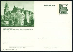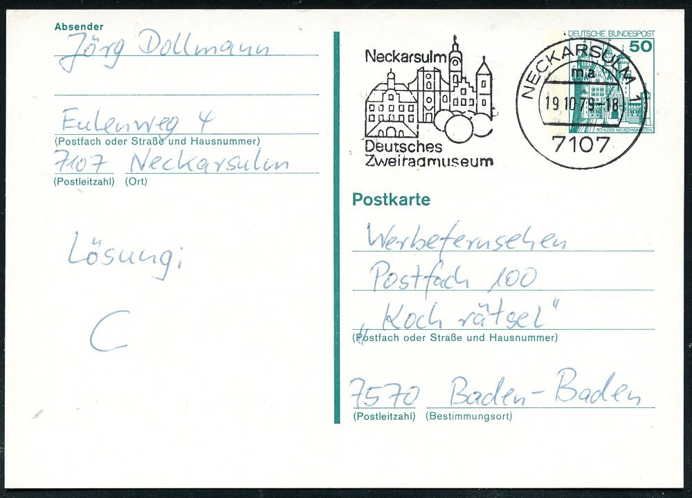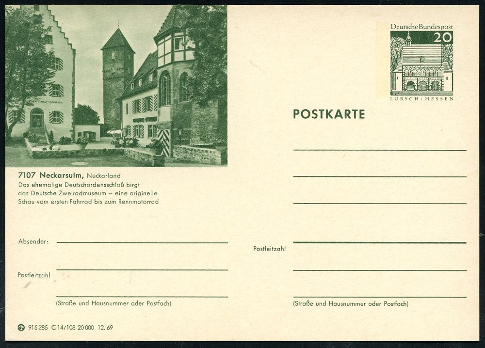 4148 | 5 € | POSTLEITRAUM 7100 (OHNE HEILBRONN u. LUDWIGSBURG) : 7107 NECKARSULM 1/ ma/ Deutsches/ Zweiradmuseum 1979 (19.10.) MWSt (Zweirad-Museum = Ordensschloß) Bedarfs-Kt. (Bo.3 A) | ![]() | |