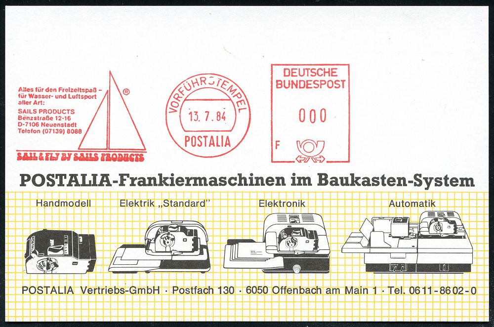 4150 | 18 € | POSTLEITRAUM 7100 (OHNE HEILBRONN u. LUDWIGSBURG) : 7106 Neuenstadt 1984 (13.7.) AFS: VORFÜHRSTEMPEL/POSTALIA/F/Alles../für Wasser-u.Luftsport/..SAILS PRODUCTS (stilis. Segelboot) seltene Postalia-Musterkt.! (= Specimen) | ![]() | |