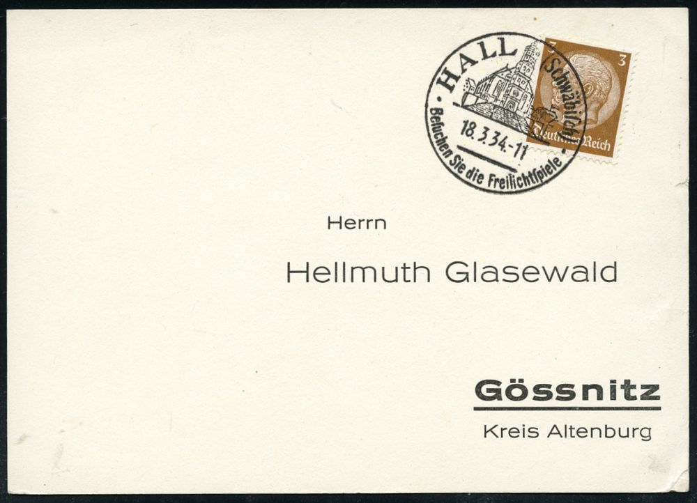 4164 | 16 € | POSTLEITRAUM 7100 (OHNE HEILBRONN u. LUDWIGSBURG) : Schwäbisch Hall 1934 (18.3.) HWSt.: HALL (Schwäbisch)/Besuchen Sie die Freilichtspiele (Kirche mit gr.Freitreppe = Theater-Bühne) auf Inl.-Karte (ex Glaswald-Slg.) klar gest.! (Bo.2 , Erstjahr) | ![]() | |