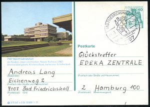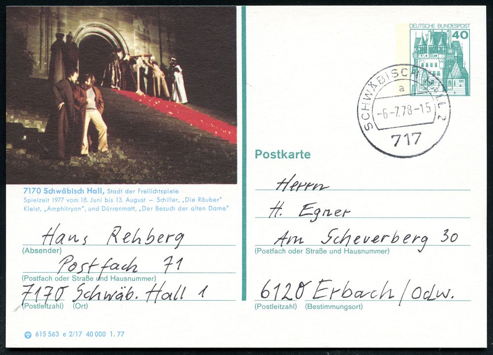 4173 | 14 € | POSTLEITRAUM 7100 (OHNE HEILBRONN u. LUDWIGSBURG) : 717 SCHWÄBISCH HALL 2/ a 1978 (6.7.) 1-Segment auf ortsgl. BiP 40 Pf. Burgen: 7170 Schwäb.Hall..Freilichtspiele.. Schiller "Die Räuber", Kleist "Amphitryon".. Dürrenmatt "Besuch des alten Dame" (Szene) Inl.-Karte, seltene Kombination! (Mi.P 124) | ![]() | |
