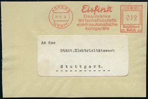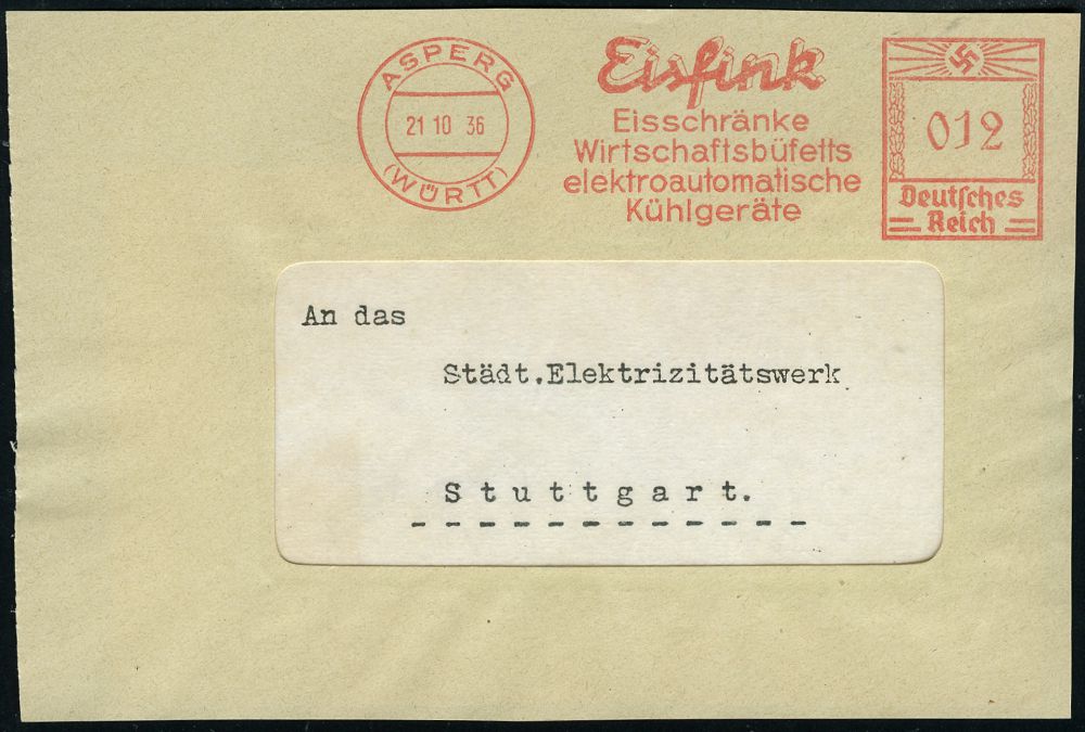 3991 | 15 € | POSTLEITRAUM 7100 (OHNE HEILBRONN u. LUDWIGSBURG) : ASPERG/ (WÜRTT)/ Eisfink/ Eisschränke/ Wirtschaftsbüfetts/ / elektroautomatische/ Kühlgeräte 1936 (21.10.) AFS Francotyp "Hakenkreuz" klar auf Vorderseite (Dü.E-3CEo) | ![]() | |
