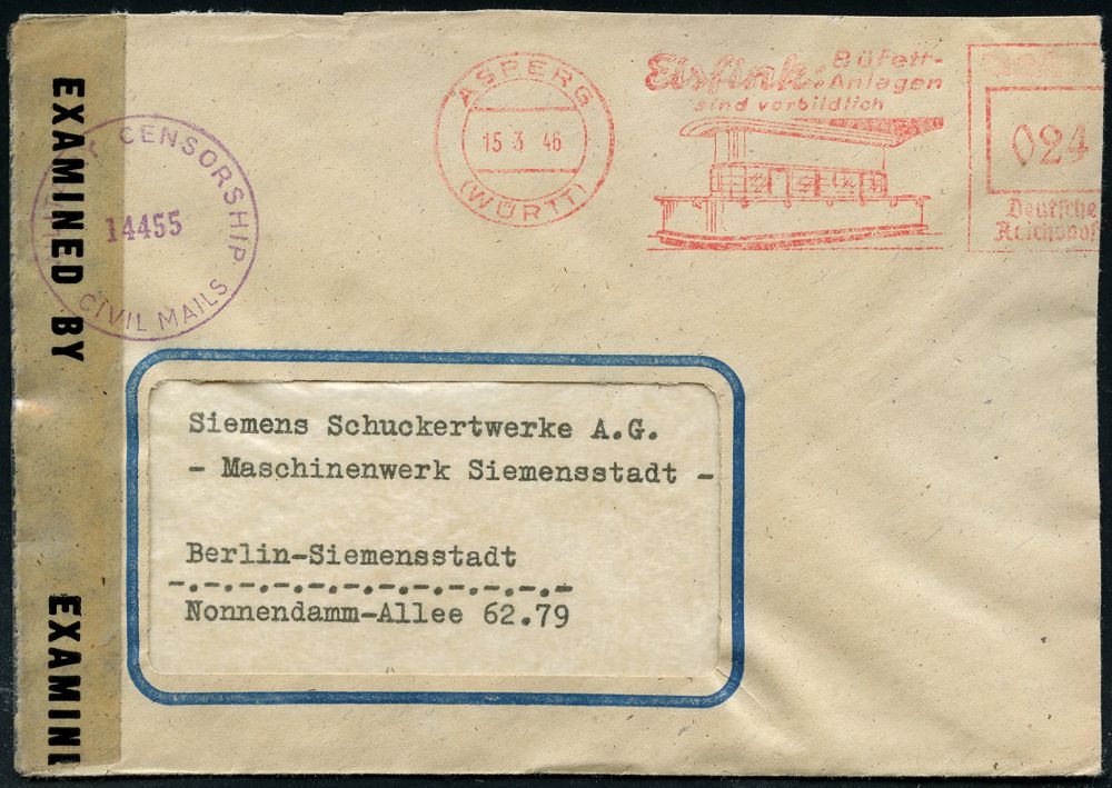 3992 | 28 € | POSTLEITRAUM 7100 (OHNE HEILBRONN u. LUDWIGSBURG) : ASPERG/ (WÜRTT)/ Eisfink/ Büfett-/ Anlagen/ sind vorbildlich 1946 (15.3.) aptierter AFS Francotyp "Reichsadler" = entfernt = Notmaßnahme! (Wertrahmen rechts nicht ganz voll) 024 Pf. (Büfett) + US-Zensurstreifen: EXAMINED BY + viol. Zensur-1K: MILITARY CENSORSHIP/ 14455/ CIVIL MAILS (= Esslingen) rs. Abs.-HdN, Inl.-Zensur-Bf. (Dü.E-13 J-127o) | ![]() ![]() | |