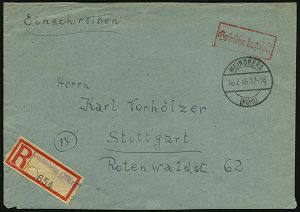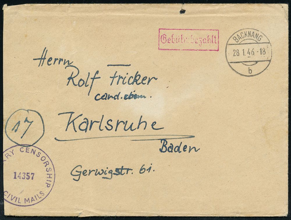 4001 | 15 € | POSTLEITRAUM 7100 (OHNE HEILBRONN u. LUDWIGSBURG) : BACKNANG/ b 1946 (28.1.) 1K-Brücke + roter Ra.: Gebühr bezahlt + US-Zensur-1K: MILITARY CENSORSHIP/14357/ CIVIL MAILS (Bf. links etwas verkürzt) = Esslingen, Inl.-Zensur-Bf. n. Karlsruhe | ![]() | |
