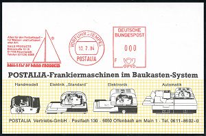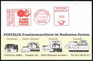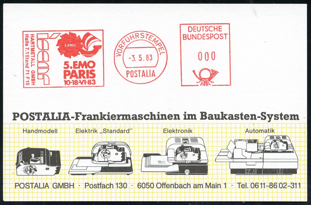 4002 | 18 € | POSTLEITRAUM 7100 (OHNE HEILBRONN u. LUDWIGSBURG) : Backnang 1983 (3.5.) AFS.: VORFÜHRSTEMPEL/POSTALIA/isenf/HARTMETALL GMBH../5. EMO/PARIS.. , seltene Postalia-Musterkarte zu einer Messe in Paris! (= Specimen) | ![]() | |