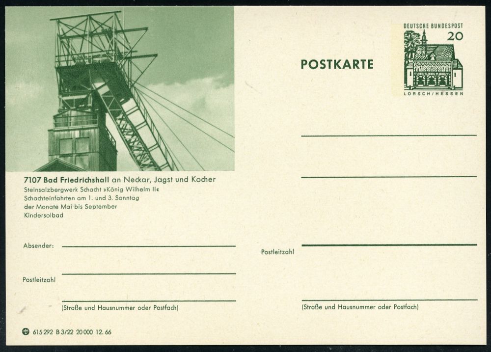 4004 | 5 € | POSTLEITRAUM 7100 (OHNE HEILBRONN u. LUDWIGSBURG) : 7017 Bad Friedrichshall 1966 20 Pf. BiP Lorsch, grün: Steinsalzbergwerk König Wilhelm II. (Förderturm) ungebr. (Mi.P 89/B 3-22) | ![]() | |