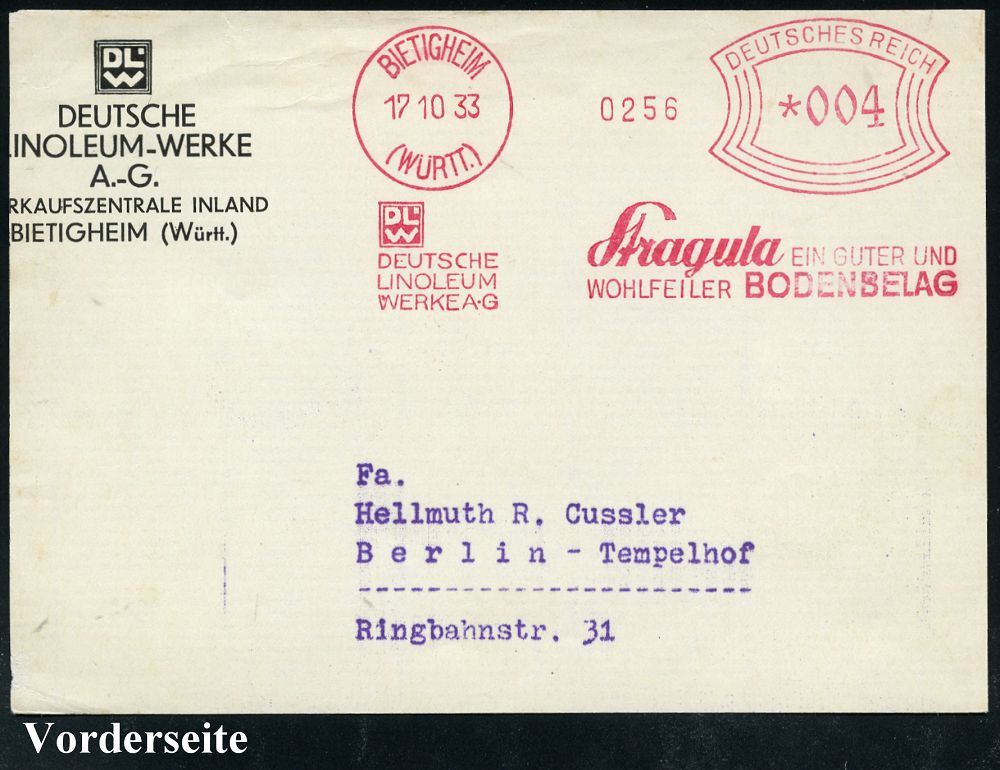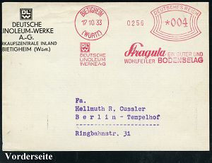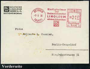 4009 | 25 € | POSTLEITRAUM 7100 (OHNE HEILBRONN u. LUDWIGSBURG) : BIETIGHEIM/ (WÜRTT.)/ DLW/ DEUTSCHE/ LINOLEUM/ WERKE AG.. 1933/36 2 verschiedene AFS Francotyp "Bogenrechteck" bzw. "Hakenkreuz" , 2 klar gest. Firmen-Vorderseite, 2 Belege (Dü.E-1Am, E-3Ao) | ![]() ![]() | |