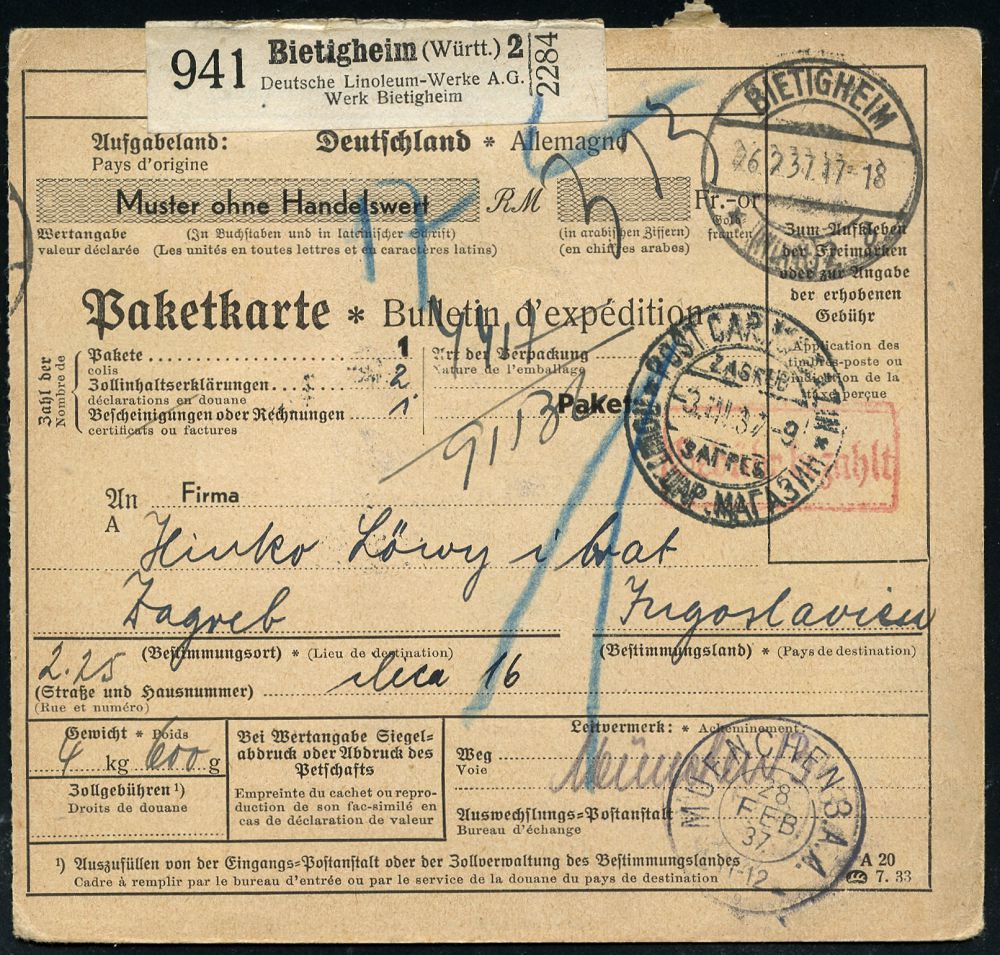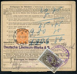 4010 | 30 € | POSTLEITRAUM 7100 (OHNE HEILBRONN u. LUDWIGSBURG) : BIETIGHEIM/ *(Württ.) 2/ b 1937 (26.2.) 1K-Brücke + roter Ra.: Gebühr bezahlt + schw. Selbstbucher-Paketzettel: Bietigheim (Württ.) 2/ Deutsche Linoleum-Werke A.-G./ Werk Bieitgheim + Transit-2K: MUENCHEN 3 A.A./9, sauber gest. Ausl.-Selbstbucher-Paket-Kt. n. Zagreb, rs. jugoslaw. Tax- u. Fiskalmarken | ![]() ![]() | |