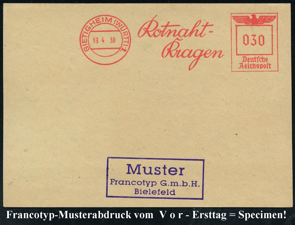 4011 | 35 € | POSTLEITRAUM 7100 (OHNE HEILBRONN u. LUDWIGSBURG) : BIETIGHEIM (WÜRTT) 1/ Rotnaht-/ Kragen 1938 (19.4.) AFS-Musterabdruck Francotyp "Reichsadler" , glasklar gest. Francotyp-Musterblatt vom V o r - Ersttag! (mit Attest), selten! (Dü.E-5CGo) | ![]() ![]() | |