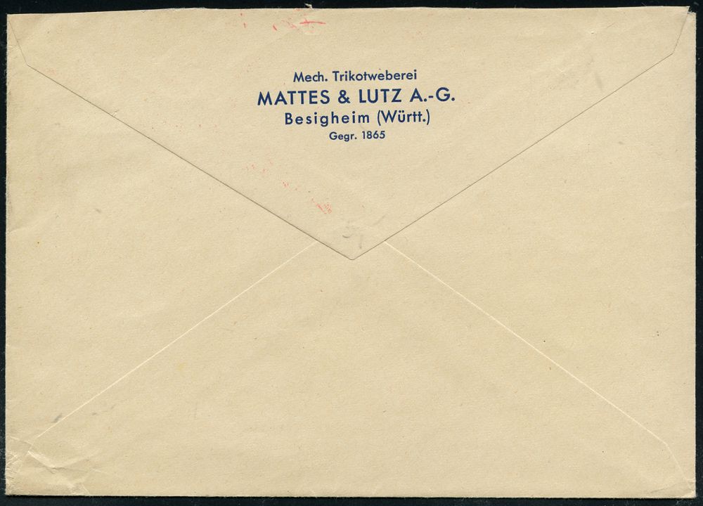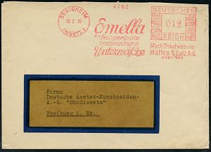 4014 | 18 € | POSTLEITRAUM 7100 (OHNE HEILBRONN u. LUDWIGSBURG) : BESIGHEIM/ (WÜRTT)/ Emella/ die feingerippte../ Unterwäsche/ Mech.TrikotwebereiMattes & Lutz AG.. 1939 (28.2.) AFS Francotyp "Mäanderrechteck" , rs. Abs.-Vordruck, Fern-Bf. (Dü.E-2CEh) | ![]() ![]() ![]() | |