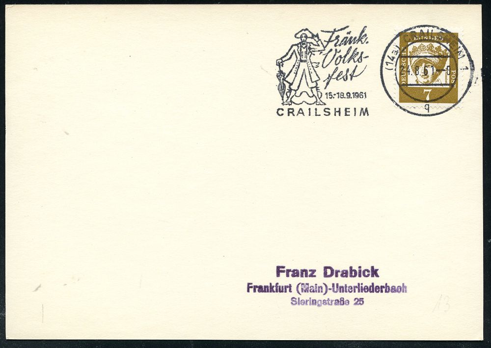 4026 | 8 € | POSTLEITRAUM 7100 (OHNE HEILBRONN u. LUDWIGSBURG) : (14a) CRAILSHEIM 1/ q/ Fränk./ Volks-/ fest/ 15.-18.9.1961.. 1961 (24.8.) MWSt (Mann in Tracht mit Regenschirm) klar gest. Inl.-Karte (Bo.13 A) | ![]() | |