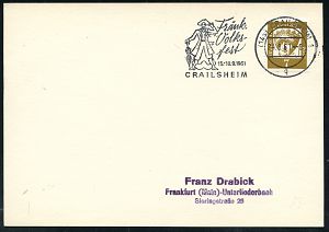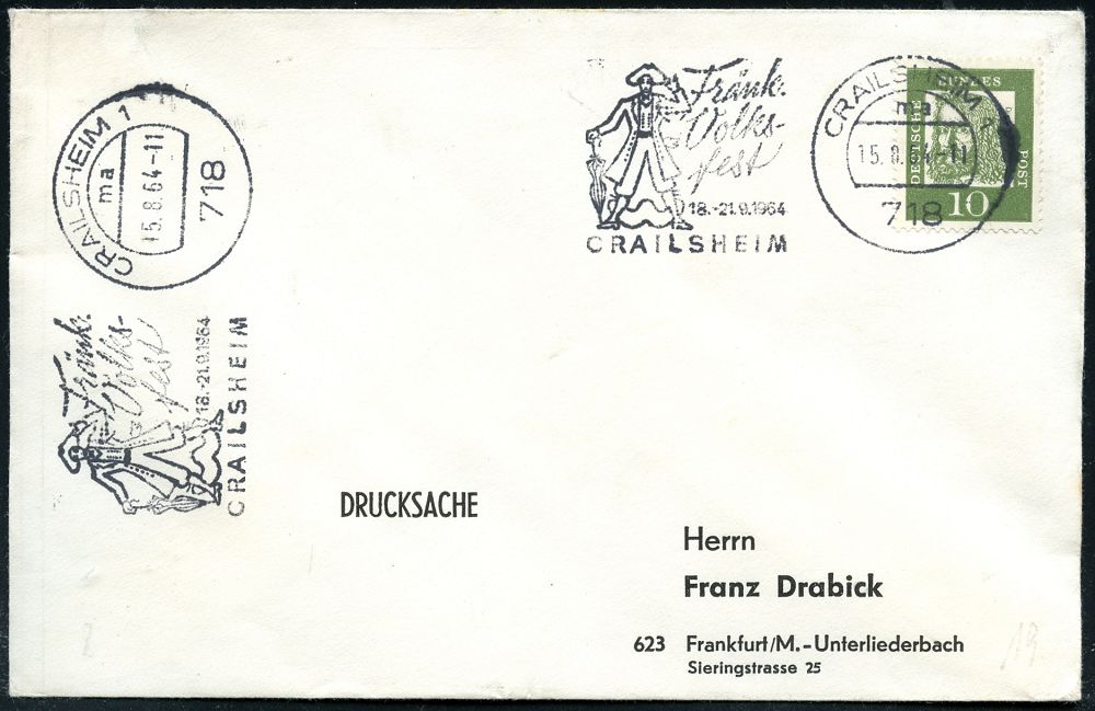 4027 | 8 € | POSTLEITRAUM 7100 (OHNE HEILBRONN u. LUDWIGSBURG) : 718 CRAILSHEIM 1/ ma/ Fränk./ Volks-/ fest/ 18.-21.9.1964 1964 (15.8.) MWSt (Mann in Tracht mit Hut u. Regenschirm) 2x klar auf Inl.-Bf. (Bo.19 A) | ![]() | |