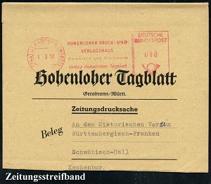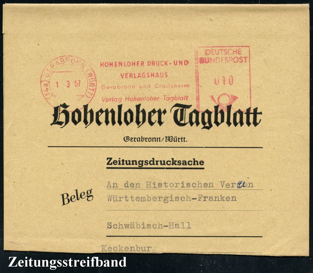 4034 | 16 € | POSTLEITRAUM 7100 (OHNE HEILBRONN u. LUDWIGSBURG) : (14a) GERABRONN (WÜRTT)/ HOHENLOHER DRUCK- UND/ VERLAGSHAUS/ Gerabronn u. Crailsheim/ Verlag Hohenloher Tagblatt 1957 (1.3.) AFS Postalia "Posthorn" 010 Pf. auf Zeitungs-Streifband: Hohenloher Tagblatt.. Zeitungsdrucksache (Dü.E-23B) | ![]() | |