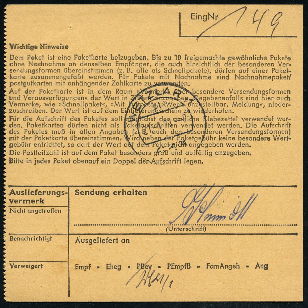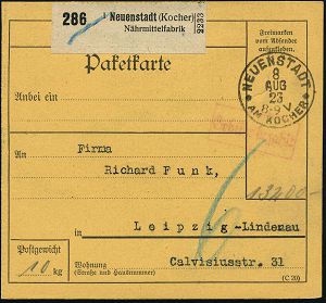 4149 | 18 € | POSTLEITRAUM 7100 (OHNE HEILBRONN u. LUDWIGSBURG) : NEUENSTADT/ AM KOCHER 1923 (8.8.) 1K (kl. Stpl.-Durchschlag) + roter Ra.: Gebühr bezahlt + Selbstbucher-Paketzettel: Neuenstadt (Kocher)/Nährmittelfabrik , klar gest.- Inl.-Selbstbucher-Paketkt. (n. Leipzig) | ![]() | |