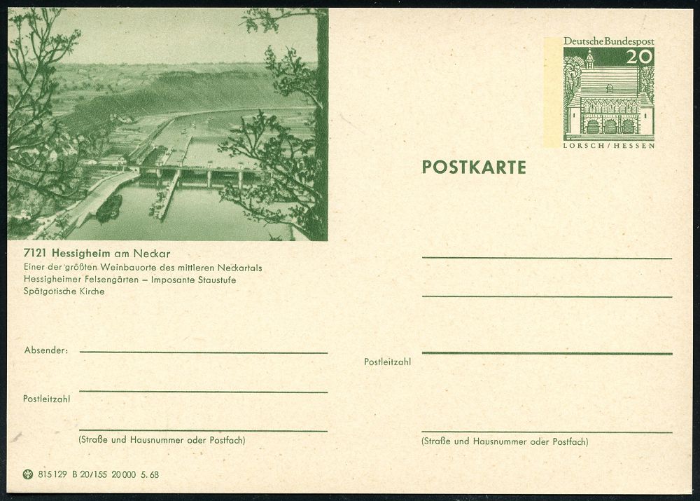 4039 | 18 € | POSTLEITRAUM 7100 (OHNE HEILBRONN u. LUDWIGSBURG) : Hessigheim am Neckar 1965/68 BiP 15 Pf. Tegel, 20 Pf. Lorsch in 2 Varianten u. 20 Pf. Lorsch Bauwerke: ...Staustufe , je ungebr. (Einzelverkauf möglich: je 5.- EUR) 4 Belege (Mi.P 86, P 89, P 91, P 96) | ![]() ![]() ![]() | |