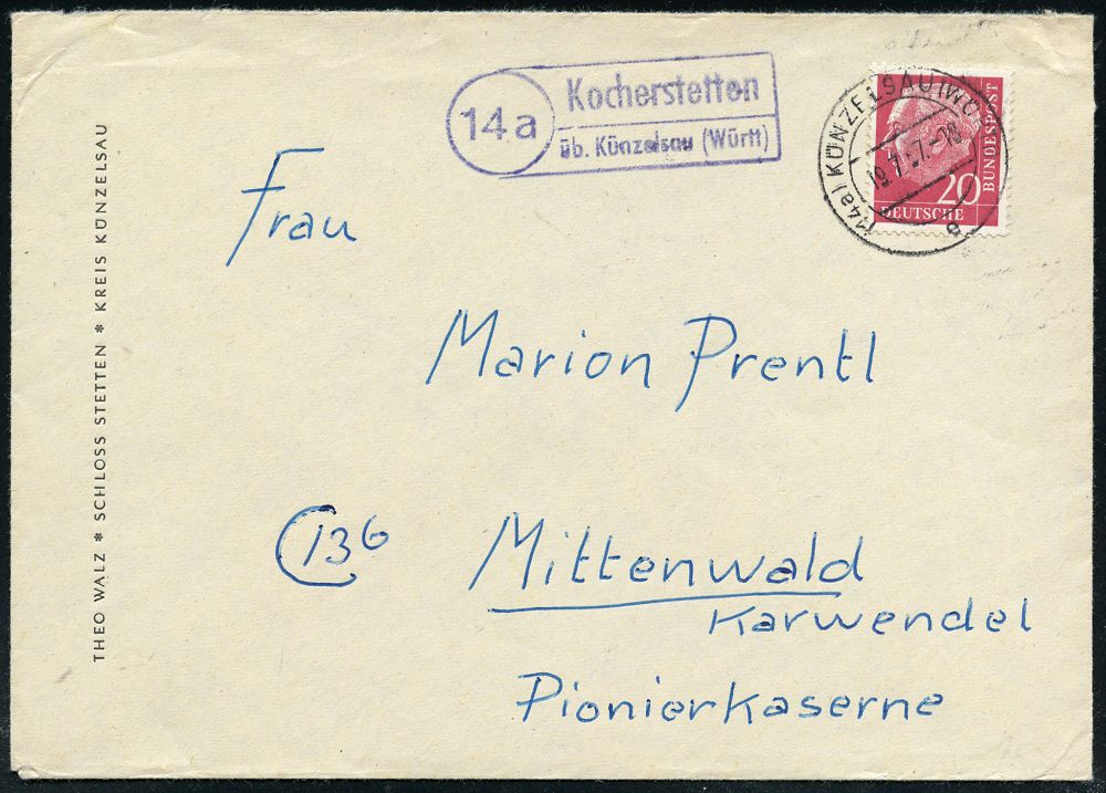 4047 | 11 € | POSTLEITRAUM 7100 (OHNE HEILBRONN u. LUDWIGSBURG) : (14a) Kocherstetten/ üb. Künzelsau (Württ) 1957 (19.7.) viol. Ra.2 = PSt.II + 2K-Steg: (14 a) KÜNZELSAU (WÜRTT)/e , sauber gest. Fern-Bf. | ![]() | |