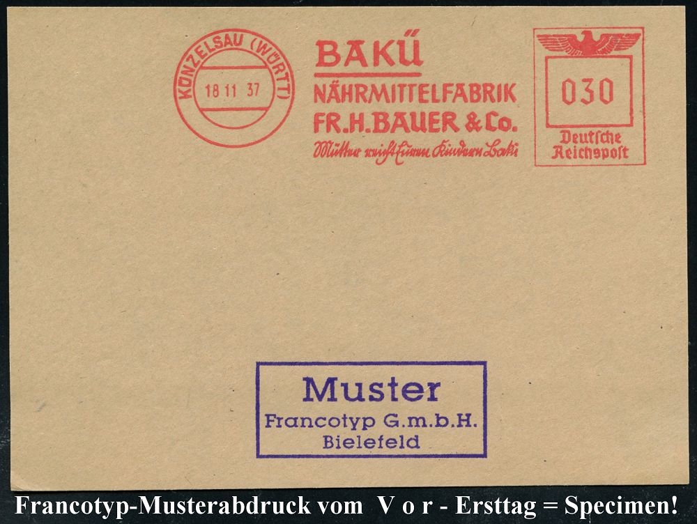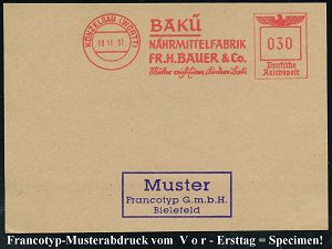 4051 | 35 € | POSTLEITRAUM 7100 (OHNE HEILBRONN u. LUDWIGSBURG) : KÜNZELSAU (WÜRTT)/ BAKÜ/ NÄHRMITTELFABRIK/ FR.H.BAUER & Co./ Mütter reicht Euren Kindern Baki 1937 (18.11.) AFS-Musterabdruck Francotyp "Reichsadler" , Text teils Sütterlin, glasklar gest. Francotyp-Musterblatt vom V o r - Ersttag! (mit Attest), selten! (Dü.E-5CGo) | ![]() ![]() | |