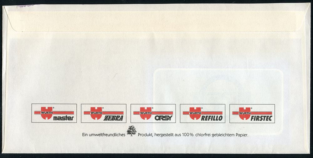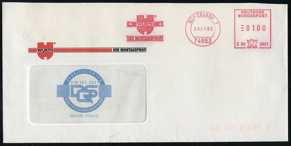 4053 | 10 € | POSTLEITRAUM 7100 (OHNE HEILBRONN u. LUDWIGSBURG) : 74653 KÜNZELSAU 1/ E60 0001/ WÜRTH/ DER MONTAGEPROFI 1993 (30.11.) AFS Pitney-Bowes mit Kennung = 1. zugelassene Maschine! (Nr.001) dekorativer Reklame-Bf.: DIN ISO 9001.. (Dü.E-26E = Erstjahr neue PLZ) | ![]() ![]() | |