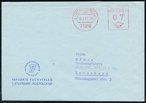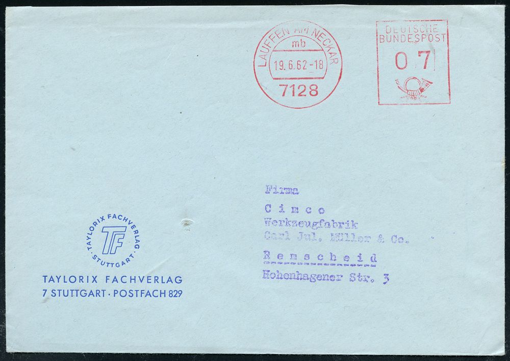 4060 | 8 € | POSTLEITRAUM 7100 (OHNE HEILBRONN u. LUDWIGSBURG) : 7128 LAUFFEN AM NECKAR/ mb/ DEUTSCHE/ BUNDESPOST 1962 (19.6.) PFS 07 Pf. "Posthorn" mit neuer PLZ = Erstjahr! , Firmen-Bf.: TAYLORIX FACHVERLAG, STUTTGART.. (Dü.D-17) | ![]() | |