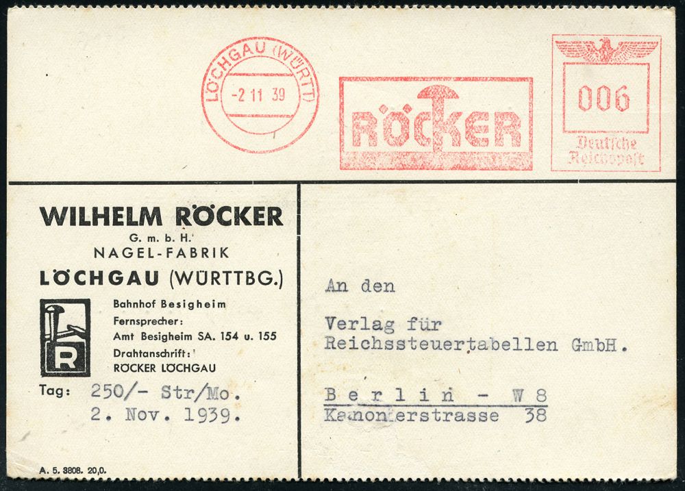 4062 | 18 € | POSTLEITRAUM 7100 (OHNE HEILBRONN u. LUDWIGSBURG) : LÖCHGAU (WÜRTT)/ RÜCKER 1939 (2.11.) AFS Francotyp "Reichsadler" (Schraube, kein Pilz!) motiv-ähnl. Firmen-Kt.: WILHELM RÖCKER GmbH, NAGEL-FABRIK.. (Dü.E-5CGo) | ![]() | |