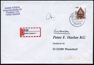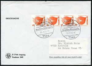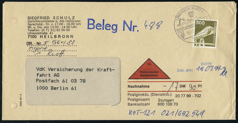 4064 | 10 € | POSTLEITRAUM 7100 (OHNE HEILBRONN u. LUDWIGSBURG) : 7101 LÖWENSTEIN,WÜRTT 1/ herrlich gelegen.. 1988 (15.7.) HWSt auf EF 300 Pf. Magnetbahn Inl.-NN-Bf.: SIEGFRIED SCHULZ, Gerichtsvollzieher.. 7100 HEILBRONN, (Reg.-Lochung geschl.) seltene Portostufe! (Mi.1138 EF + 10.- EUR) | ![]() | |