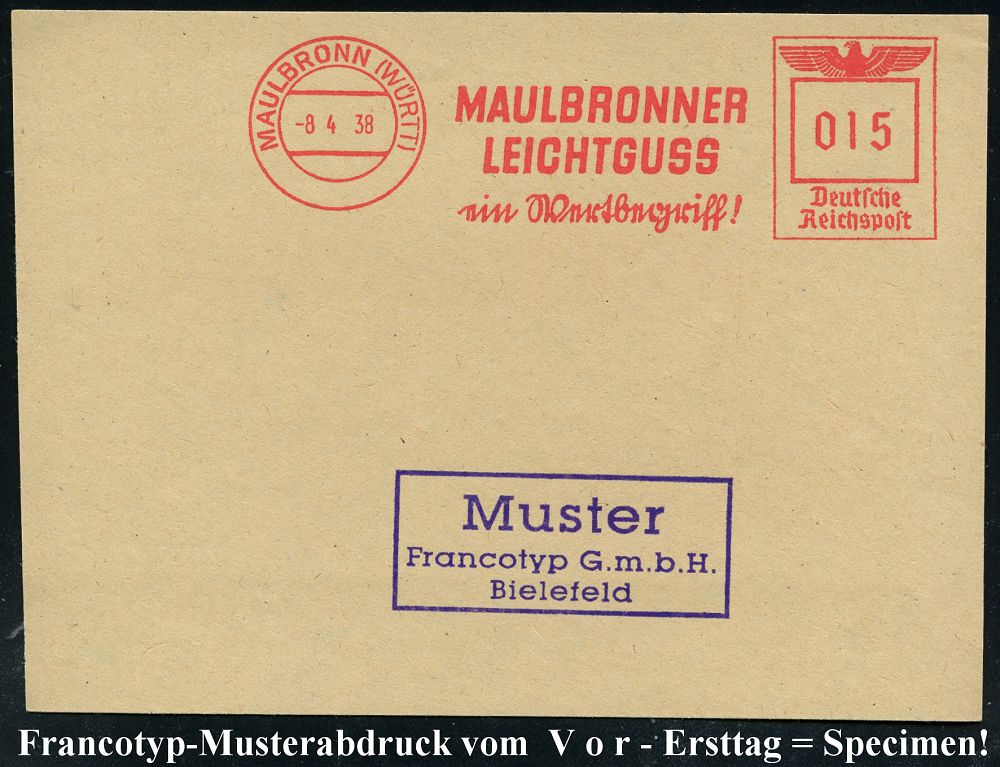 4127 | 35 € | POSTLEITRAUM 7100 (OHNE HEILBRONN u. LUDWIGSBURG) : MAULBRONN (WÜRTT)/ MAULBRONNER/ LEICHTGUSS/ ein Wertbegriff! 1938 (8.4.) AFS-Musterabdruck Francotyp "Reichsadler" , Text teils Sütterlin!, glasklar gest. Francotyp-Musterblatt vom V o r - Ersttag! (mit Attest), selten! (Dü.E-5CGo) | ![]() ![]() | |