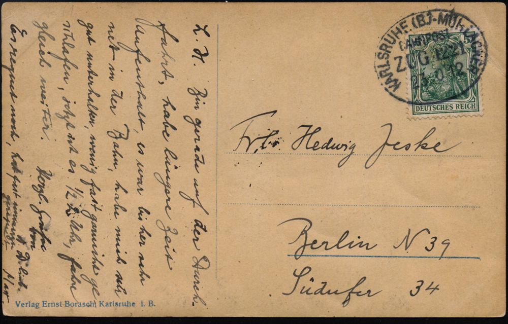 4133 | 12 € | POSTLEITRAUM 7100 (OHNE HEILBRONN u. LUDWIGSBURG) : KARLSRUHE (B)-MÜHLACKER/ BAHNPOST/ ZUG 1221 1912 (23.10.) Bahn-Oval klar auf s/w.-Foto-Ak.: Karlsruhe (Rathaus) n. Berlin (Mi.85 I) | ![]() ![]() | |