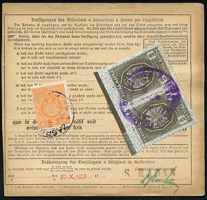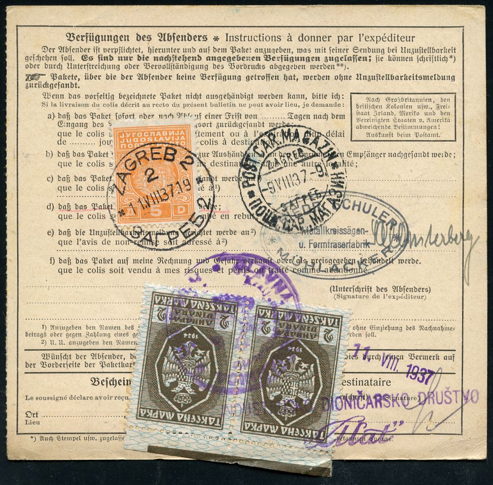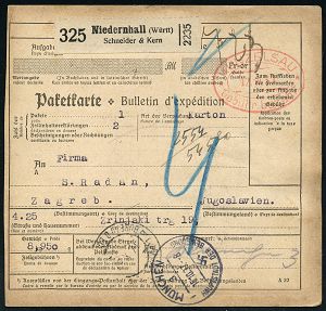 4050 | 30 € | POSTLEITRAUM 7100 (OHNE HEILBRONN u. LUDWIGSBURG) : KÜNZELSAU/ **/ Gebühr bezahlt 1937 (15.10.) Doppel-Oval-PFS + schw. Selbstbucher-Paketzettel: Niedernhall (Württ)/ Schneider & Kern + TS München 3, Ausl.-Selbstbucher-Paket-Kt. n. Zagreb, rs. jugoslaw. Porto- u. Fiskalmarken (Dü.A-5, Nr.20) | ![]() ![]() | |